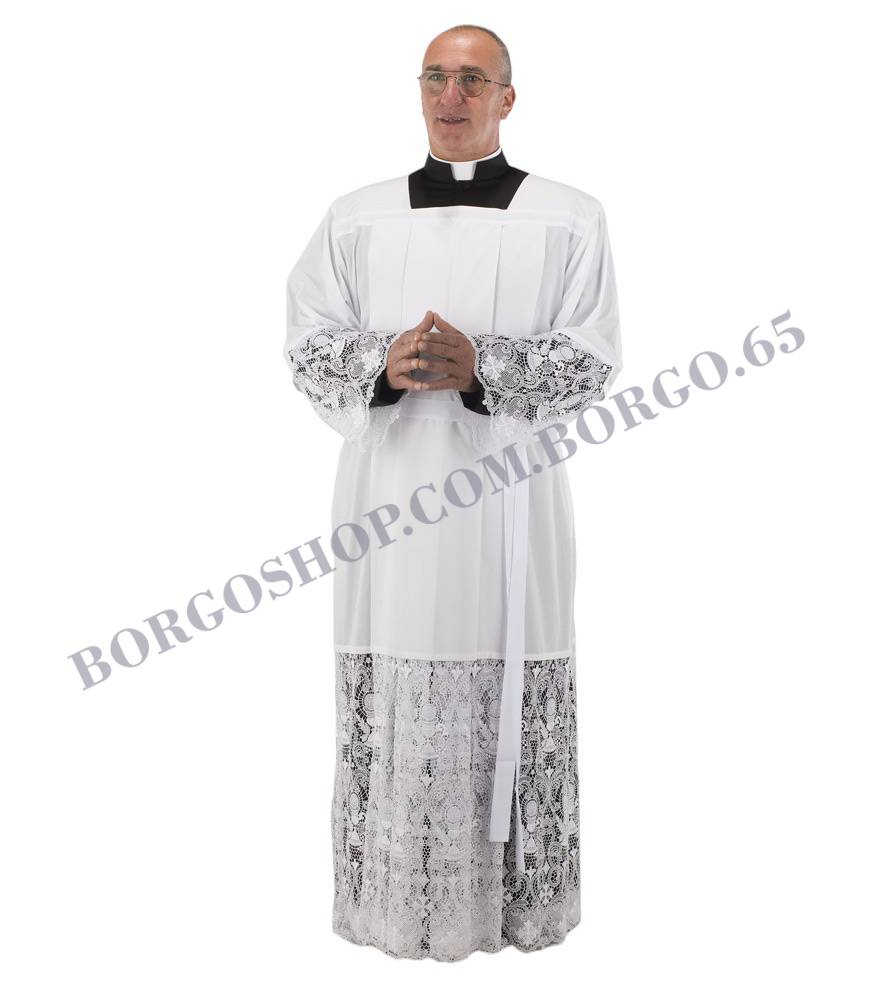 WHITE ALBA cotton 75% linen 25% gown with MACRAME ‘lace cm. 60 on the mantle, cm. 30 on the sleeves.