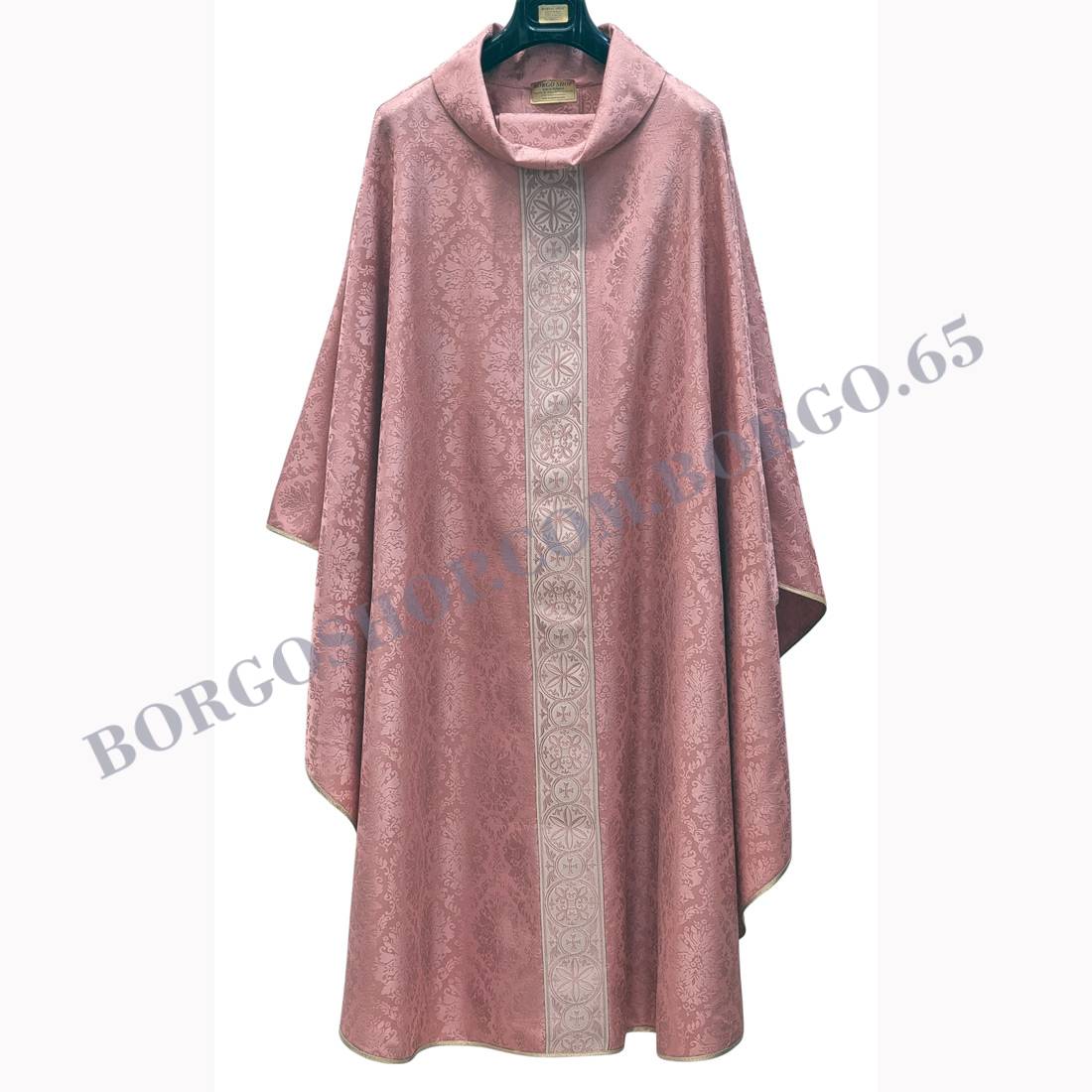 ELEGANTE y moderna casulla ROSA con tejido DAMASCO, cuello catedral, con banda tono sobre tono