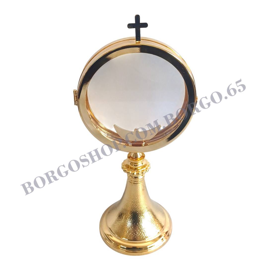 TECA Vitrina de latón bañado en oro, artículo n.° 507, con un diámetro de 12,5 cm y bisel, base de cáscara de naranja y un nudo central con corona.